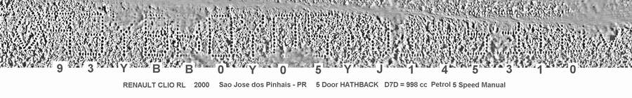 Tecnologia VINRAIDER: recuperação da numeração do chassi do veículo RENAULT CLIO ano 2000 queimado. Na foto nº1-chapa com numeração do chassi queimada. Na foto nº2-o decalque digital da numeração (CRVA 001)