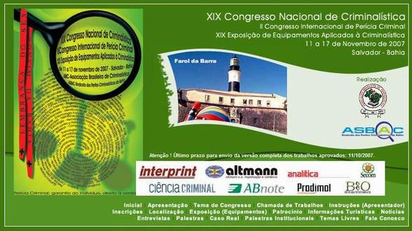 | XIX CONGRESSO NACIONAL DE CRIMINALÍSTICA: 11-17.11.2007, SALVADOR-BA |